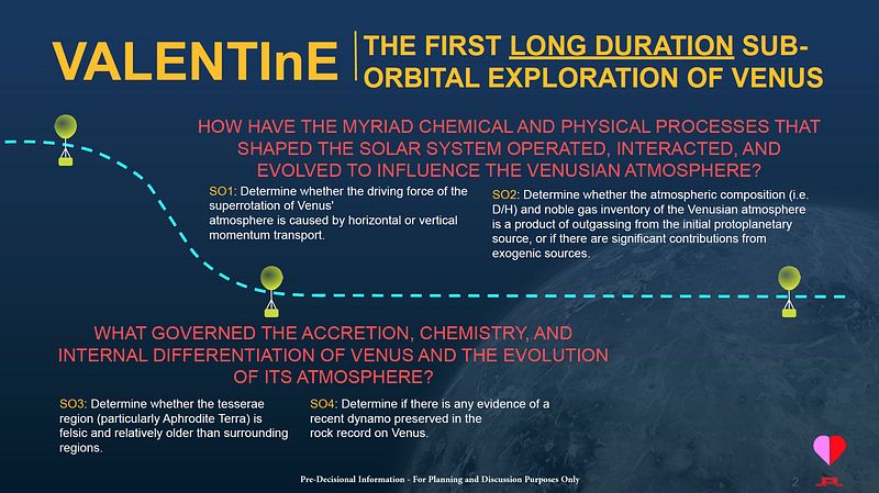 Our overall mission design and the four main science questions VALENTInE would address. This is the intellectual property of the VALENTInE team.