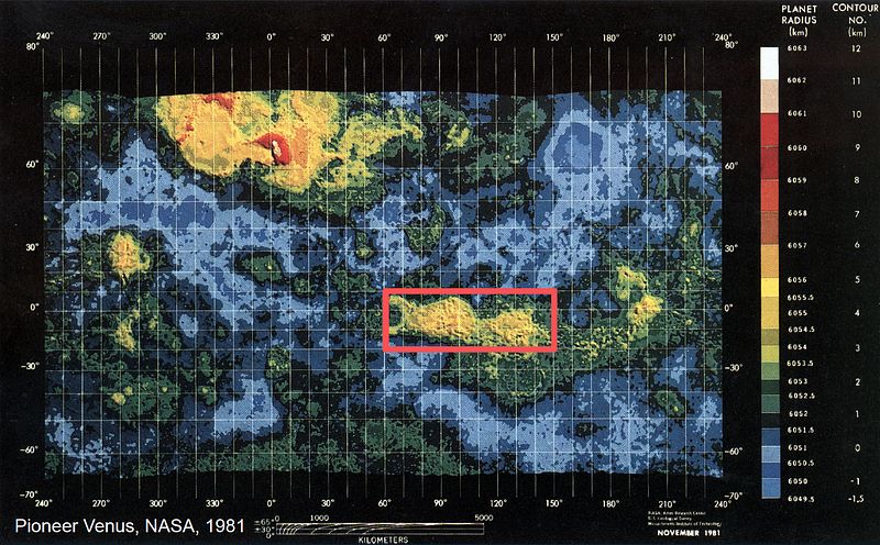 Venus may have had plate tectonics in its past, but they are not active today. The area we propose to study, Aphrodite Terra (red box), may be a piece of an ancient continent on Venus. Derived from the Venus basemap from Pioneer mission data, NASA.